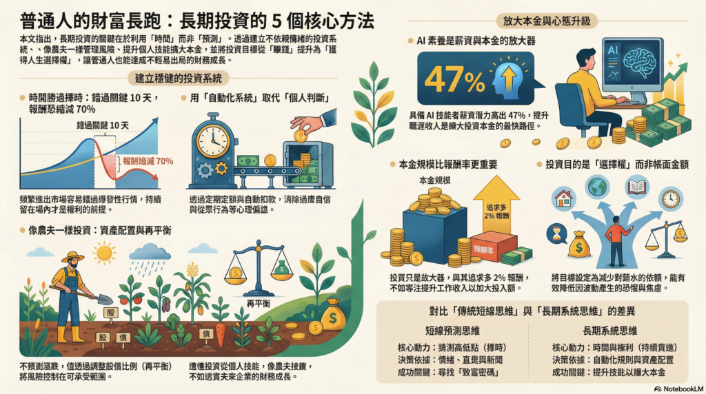 長期投資的關鍵在於以「自動化定期定額」克服人性,並透過「資產配置」與「紀律再平衡」穩健累積財富。
